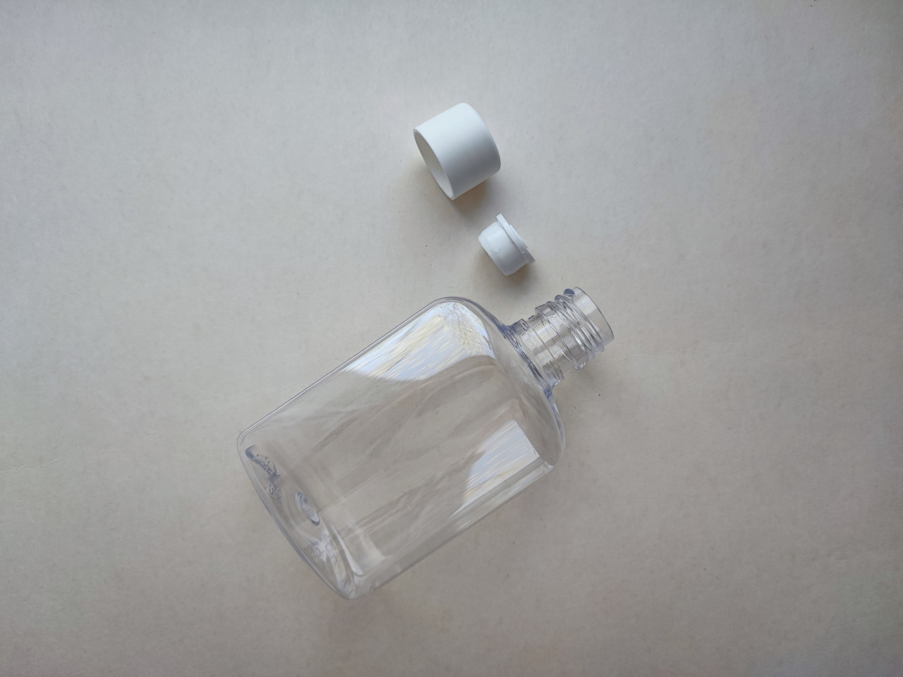 100 - 111 мл ПЕТ Квадрат прозорий зі вставкою і білою кришкою 20 мм ПЕТ флакон пластиковий, пластмасовий
