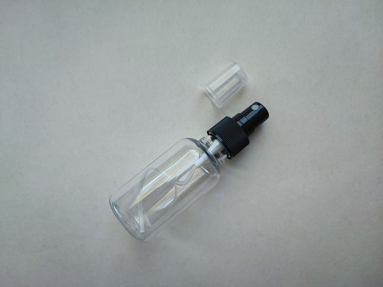 50 - 55 мл ПЕТ круглий прозорий з чорним розпилювачем 20/410 флакон пластиковий, пластмасовий в комплекті